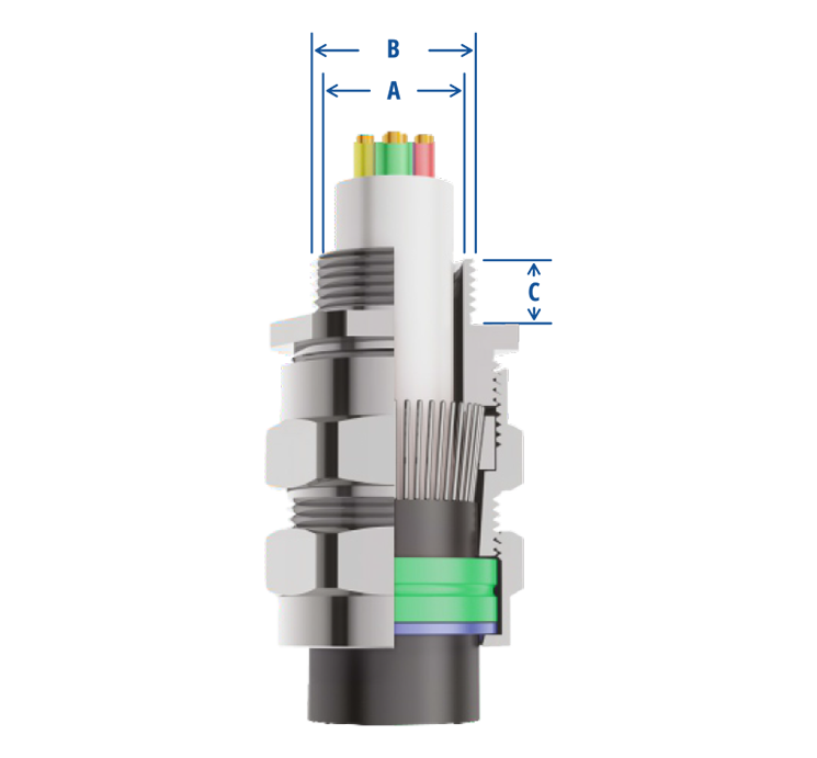| GLAND SIZE | THREAD SIZE ‘B’ | THREAD LENGTH ‘C’ (MM) | CABLE DIAMETER ‘A’ | PRODUCT CODE | ||