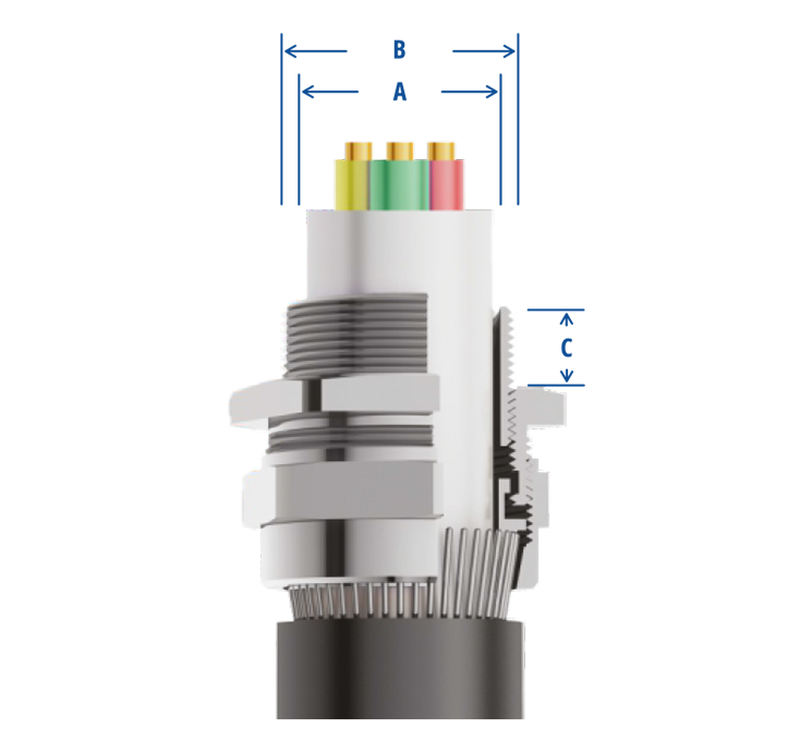 | GLAND SIZE | THREAD SIZE ‘B’ | THREAD LENGTH ‘C’ | CABLE DIAMETER ‘A’ | PRODUCT CODE | ||