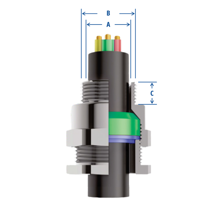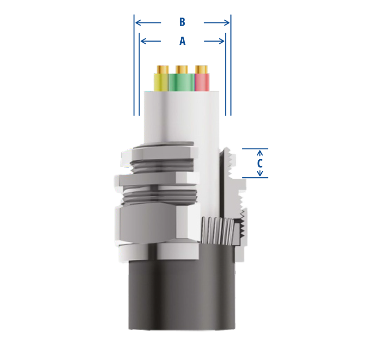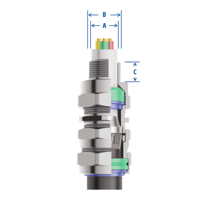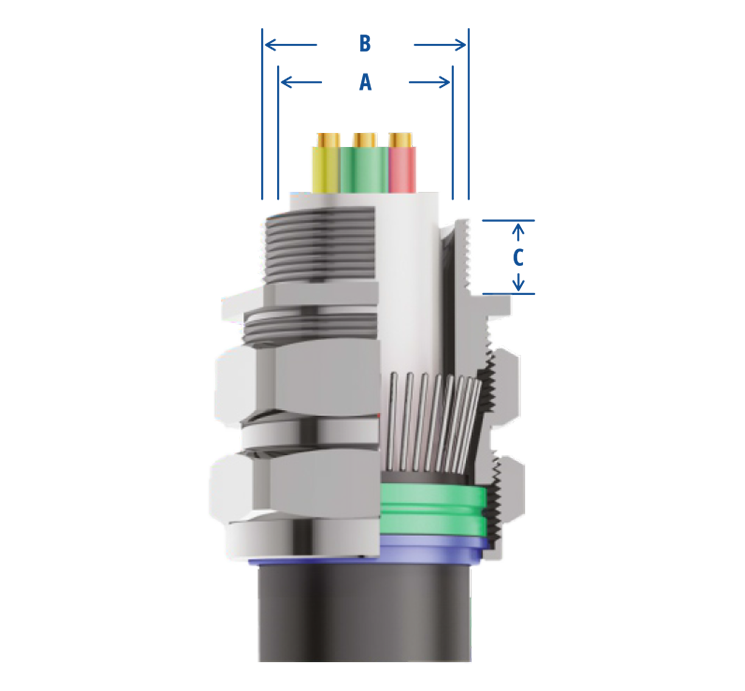 | GLAND SIZE | THREAD SIZE ‘B’ | THREAD LENGTH ‘C’ | CABLE DIAMETER ‘A’ | PRODUCT CODE | ||